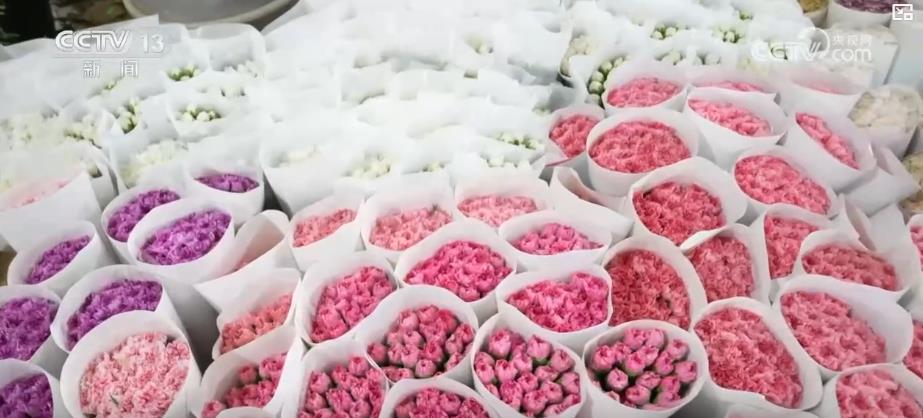 正在昆明一家花草商业公司,工人们正加班加点对方才集中采购回来的康乃馨进行二次分级包拆。