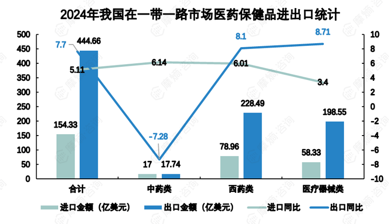 2024年我国对 “一带一”市场的医药出口额达444。66亿美元,同比增加7。7%。其药类出口额228。49亿美元,医疗器械类198。55亿美元,同比增速别离为8。1%和8。71%。