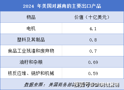 2024年,美国是越南第二大商业伙伴,也是其最大出口市场,双边商业额达1496亿美元,同比增加20。4%。越南成为美国第六猛进口来历国,进口总额1366亿美元,对美商业顺差达1235亿美元,创汗青新高。美国从越南进口的次要商品包罗电机、核反映堆、家具、鞋类及服拆。